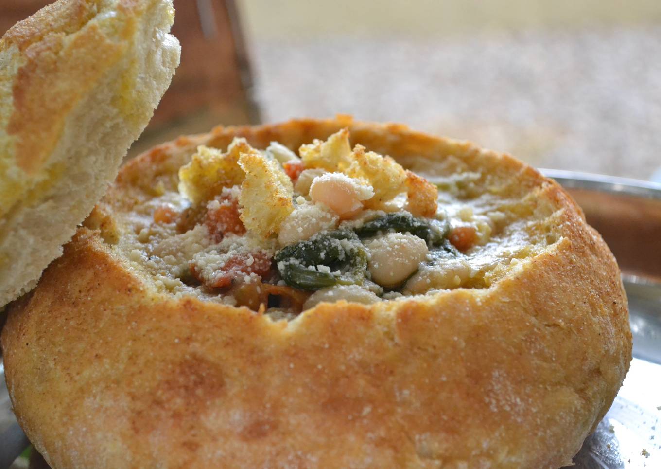 - Ladle the soup into the baked bread bowls, sprinkle with grated parmesan cheese and enjoy!