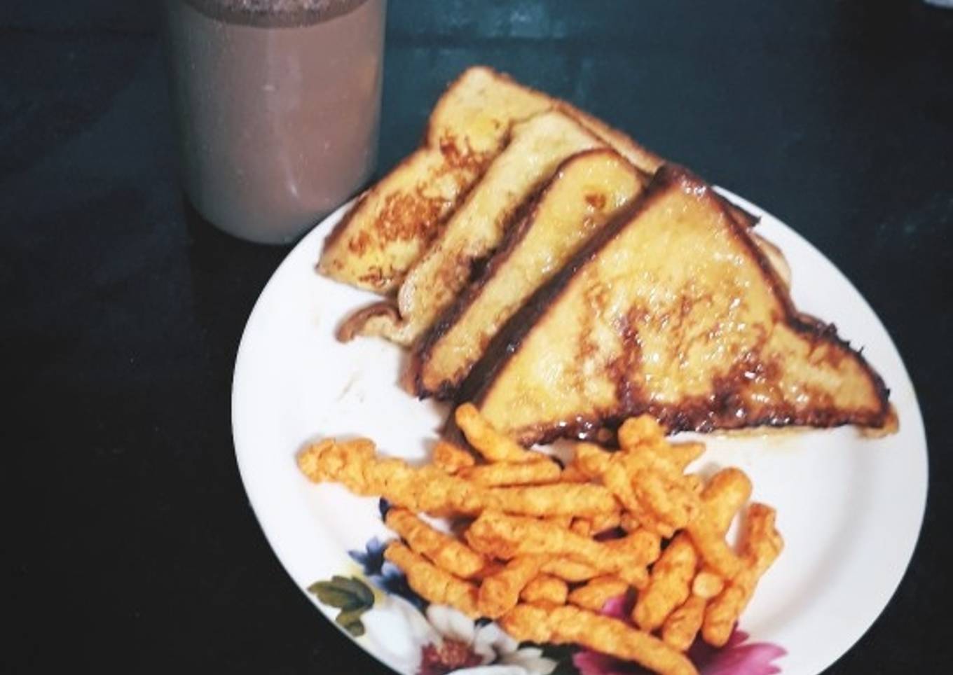 - Beat two eggs with the milk, sugar, a pinch of cinnamon, sugar and salt to taste. Cut bread slices into triangles and dip them in the beaten egg mixture for a min. Heat butter in a pan and cook bread slices until brown and slightly crisp. Serve with maple syrup/honey. With some fresh fruits, i served with some crisps and a glass of chocolate milkshake.