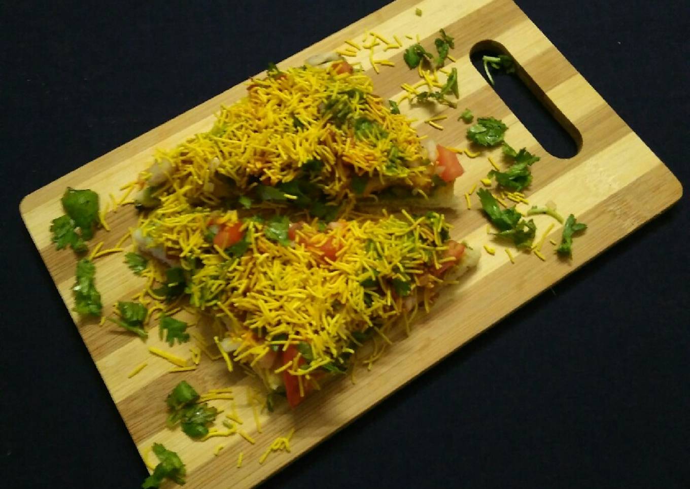 - Apply chopped onion, tomatoes and coriander leaves over it. Apply green chutney and red garlic chutney. Sprinkle chat masala and lot of nylon Sev. Enjoy.