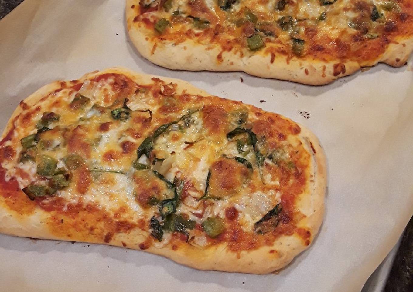 - Place on whatever toppings you'the like (in the picture, we went with a veggie pizza with peppers, onions and baby spinach). Bake for 12-20 minutes (times vary depending on how hot your oven runs) until the crust is lightly browned. Then slice it and serve.