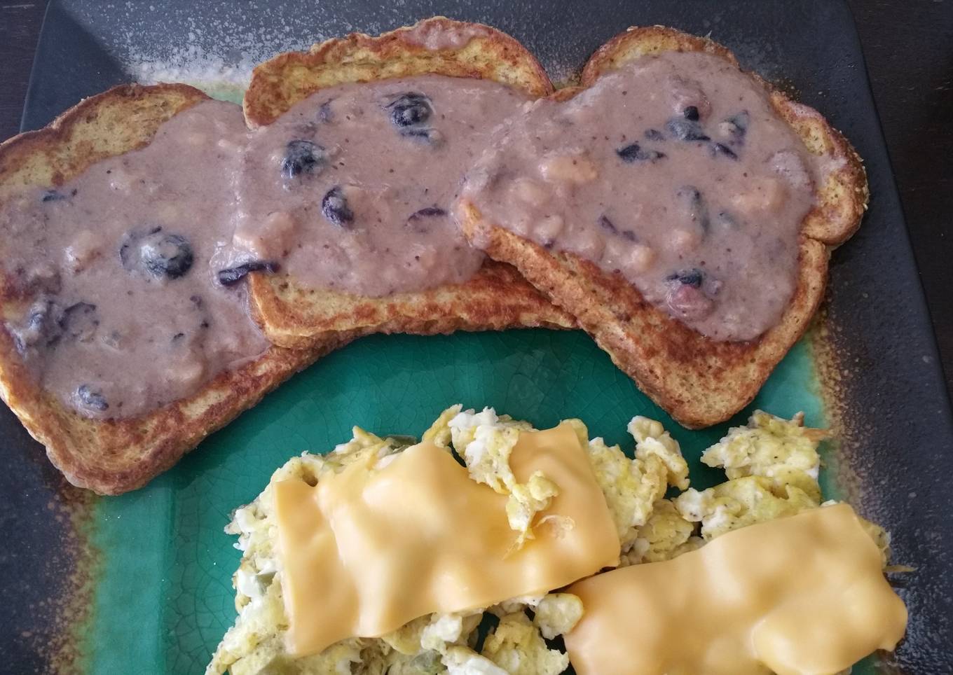 - Take toast off the skillet, top with fruit mixture and powdered sugar. Enjoy!