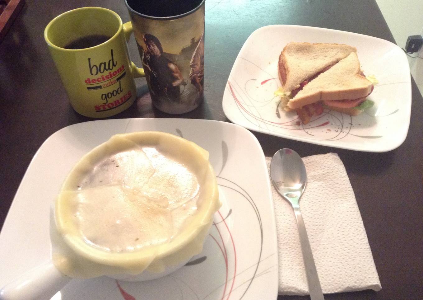 - Add top slice of bread and enjoy! I served with A crock of French onion soup!