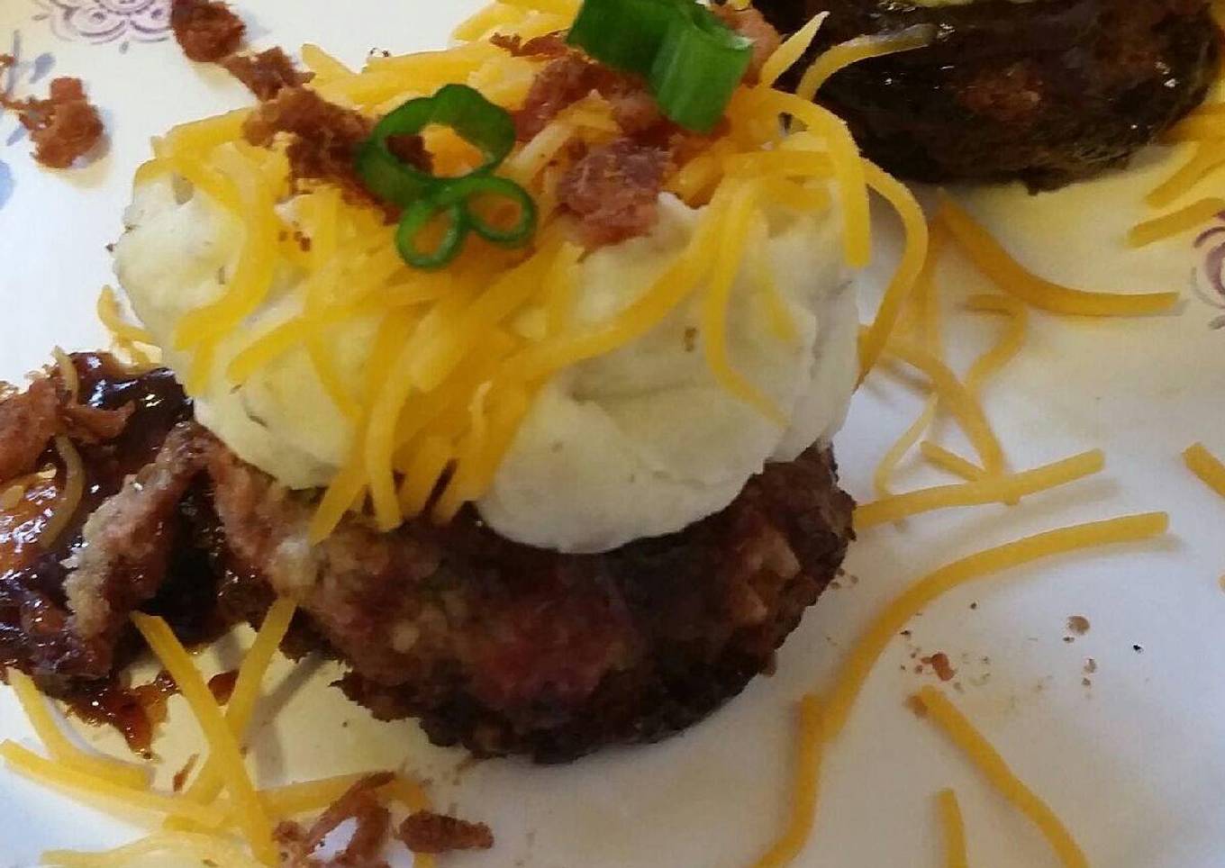 - Combine all ingredients with your hands, except mashed potatoes, chives, bacon, cheese, sour cream, and bbq sauce.