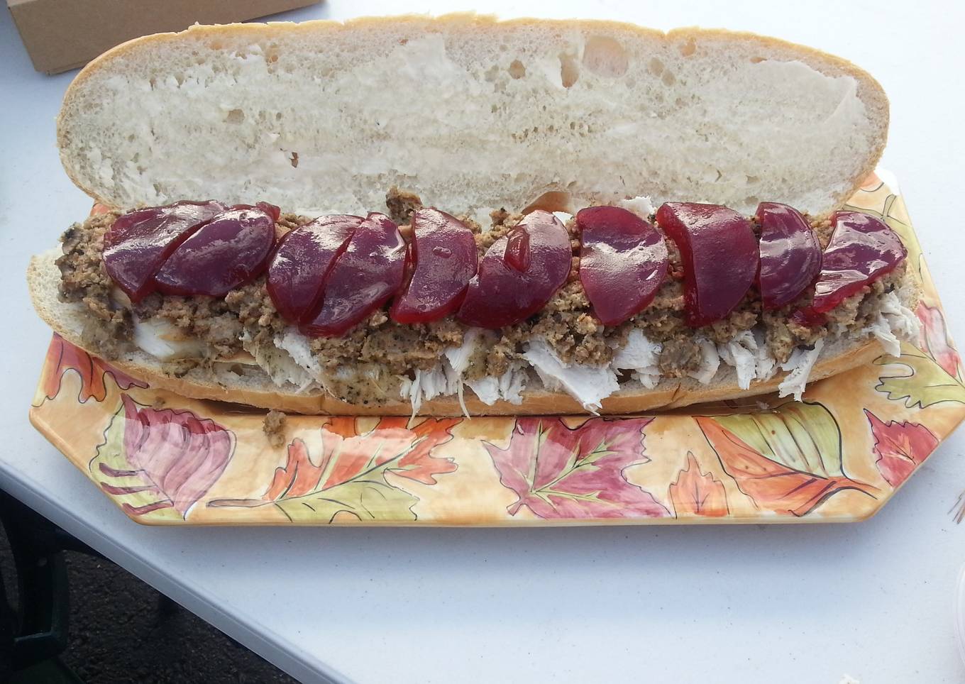 - Layer sliced turkey into loaf, top with sausage stuffing then cranberry sauce.