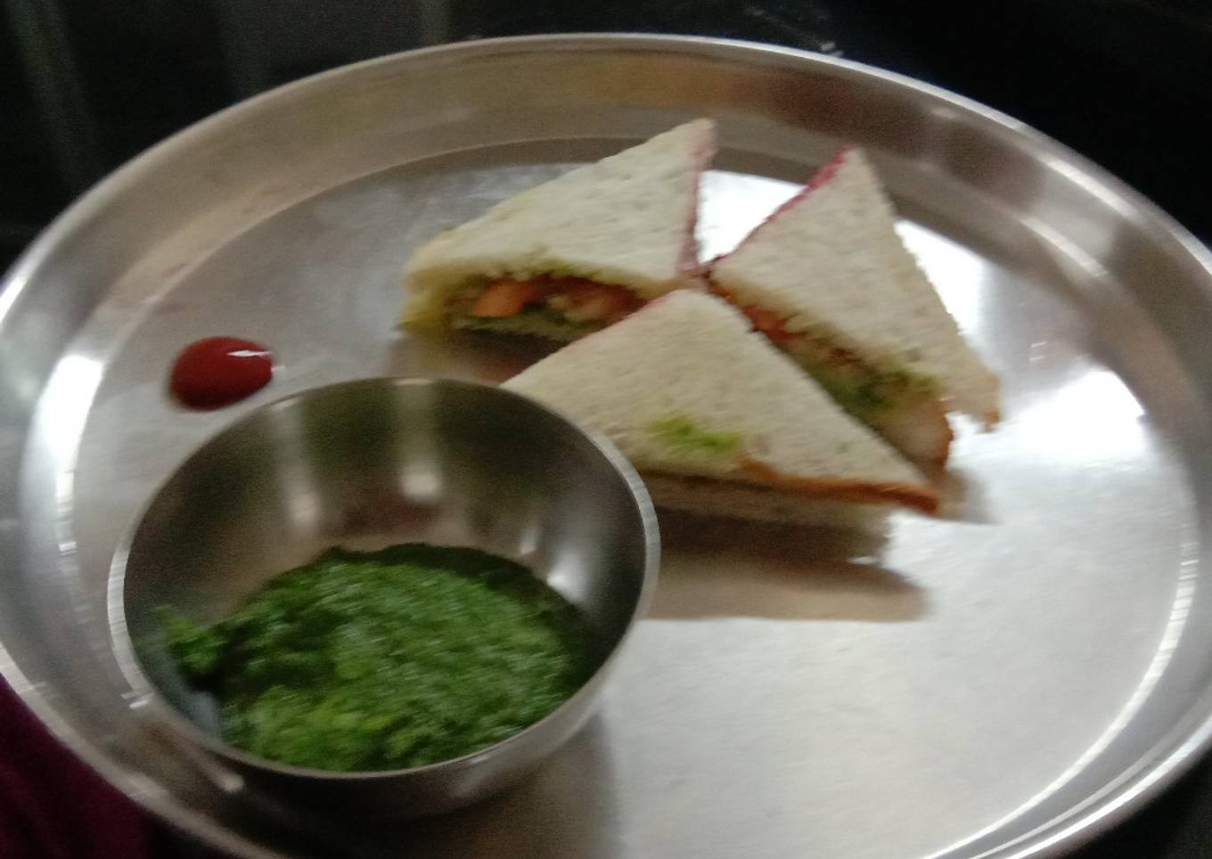 - Take bread slices cut it border apply butter on all slices now apply grreen chatny keep aside now cut all vegetable in slices put one by one on bread slices then sprinkle sandwich masala and black peper powder put anthor slice of bread with butter and chatny cut in triangle shape serve with green chatny and sauce